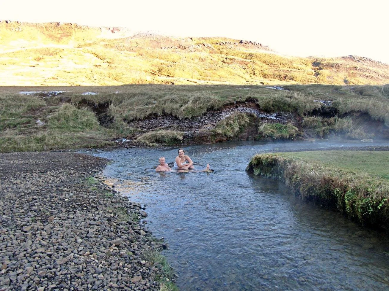 A trail behind Frost and Fire Hotel will take you to this awesome river, fed by a boiling hot and a cold stream. In the middle, the water temperature is just right. You might have to wiggle a bit depending on the currents! Eli’s dad is enjoying it!