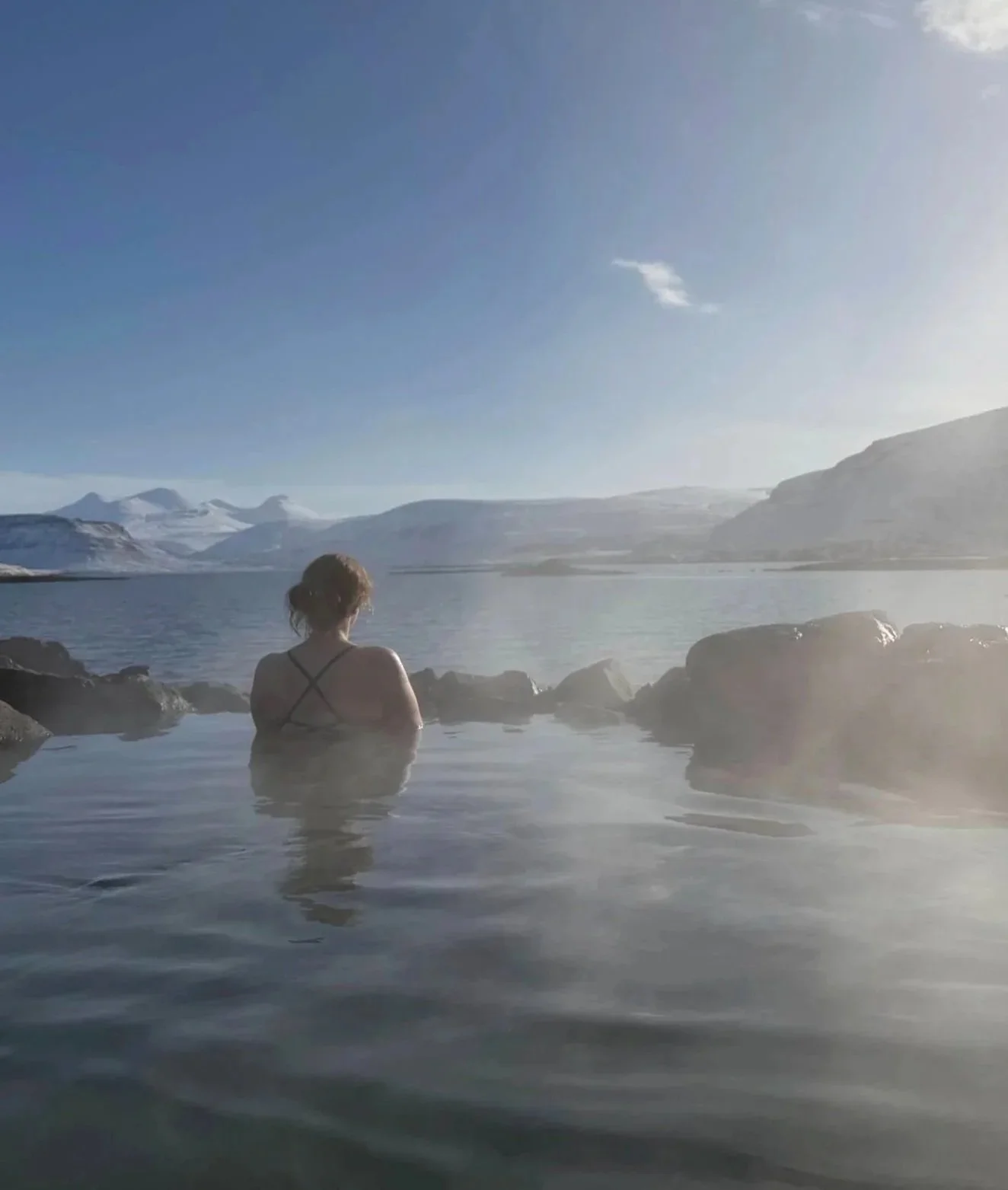 Pic: Eli enjoying a sunny winter day at Hvammsvík Hot Springs