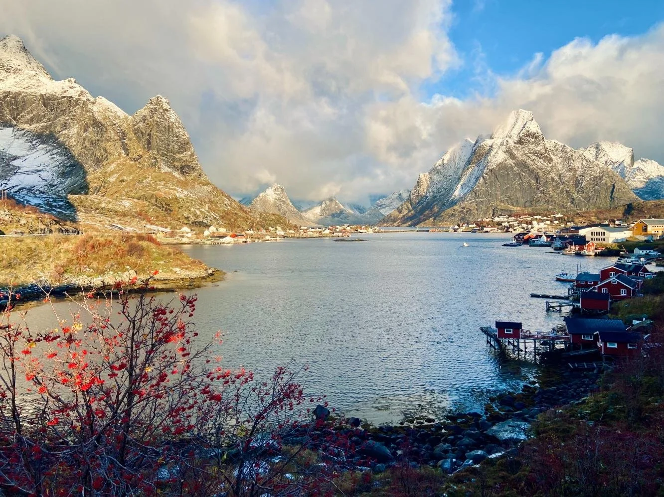Snow on jagged peaks. Red rorbuer glowing against icy fjords. Northern lights dancing above fishing villages.