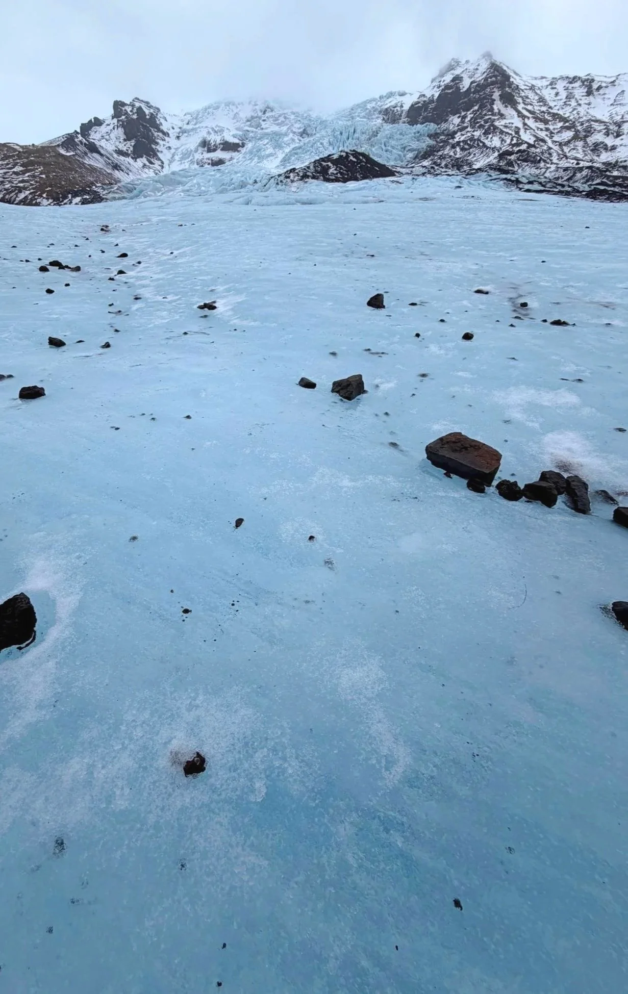 A “buggy” bus took us from base camp to the glacier edge, and the transition from ordinary ground was incredible. One moment you're on rock and gravel; the next, crampons are crunching into the surface of a glacier that covers eight percent of Iceland. It’s not immediately the photogenic smooth expanse that turns up on screensavers. It is ridged, fractured, and striated with dark ash layers from eruptions that happened centuries ago. And that’s actually what makes Iceland’s glaciers unique.