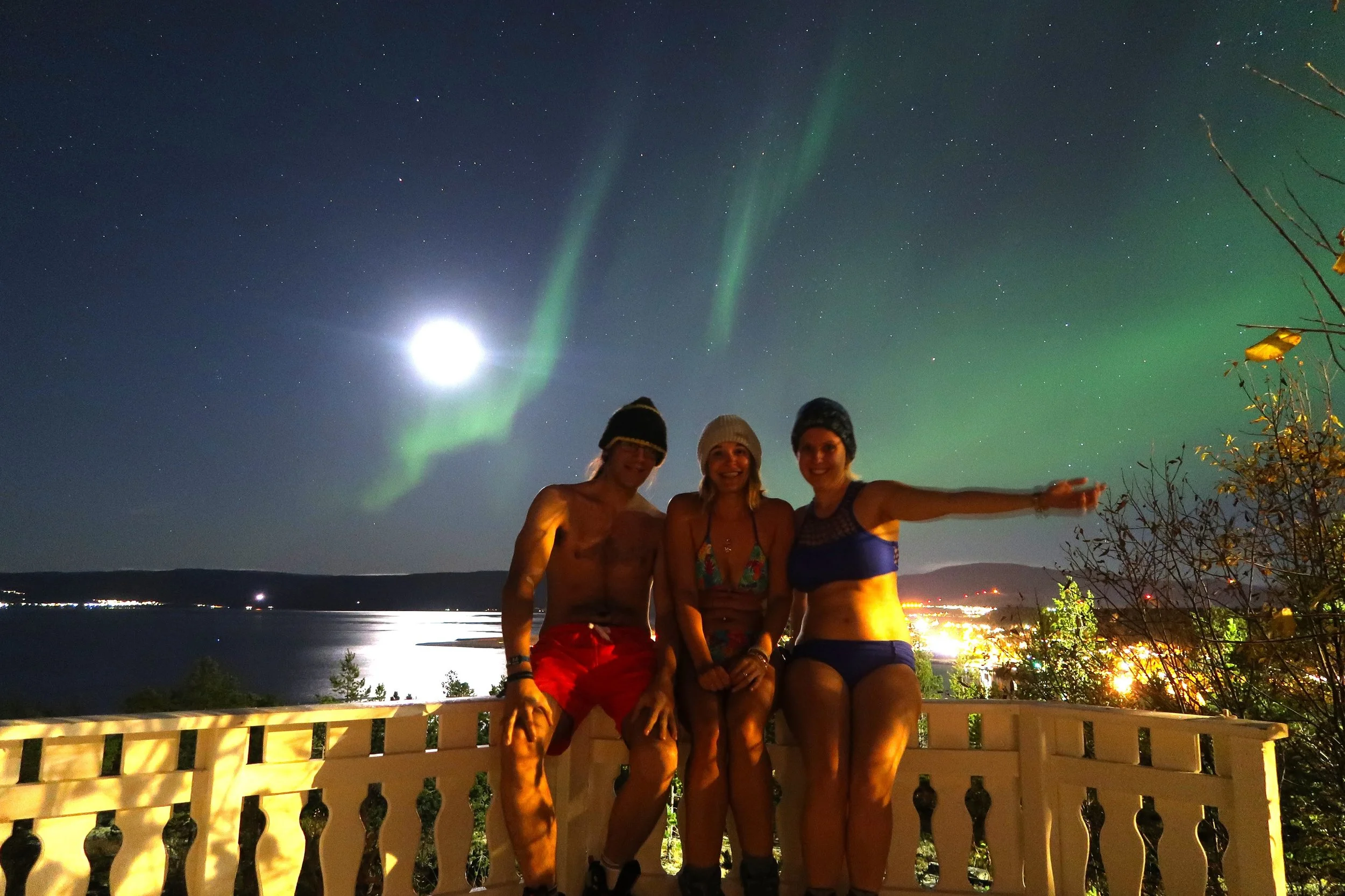 After a sauna, a swim suit pic under the northern lights — because why not? Ok, it was October so not that cold yet!