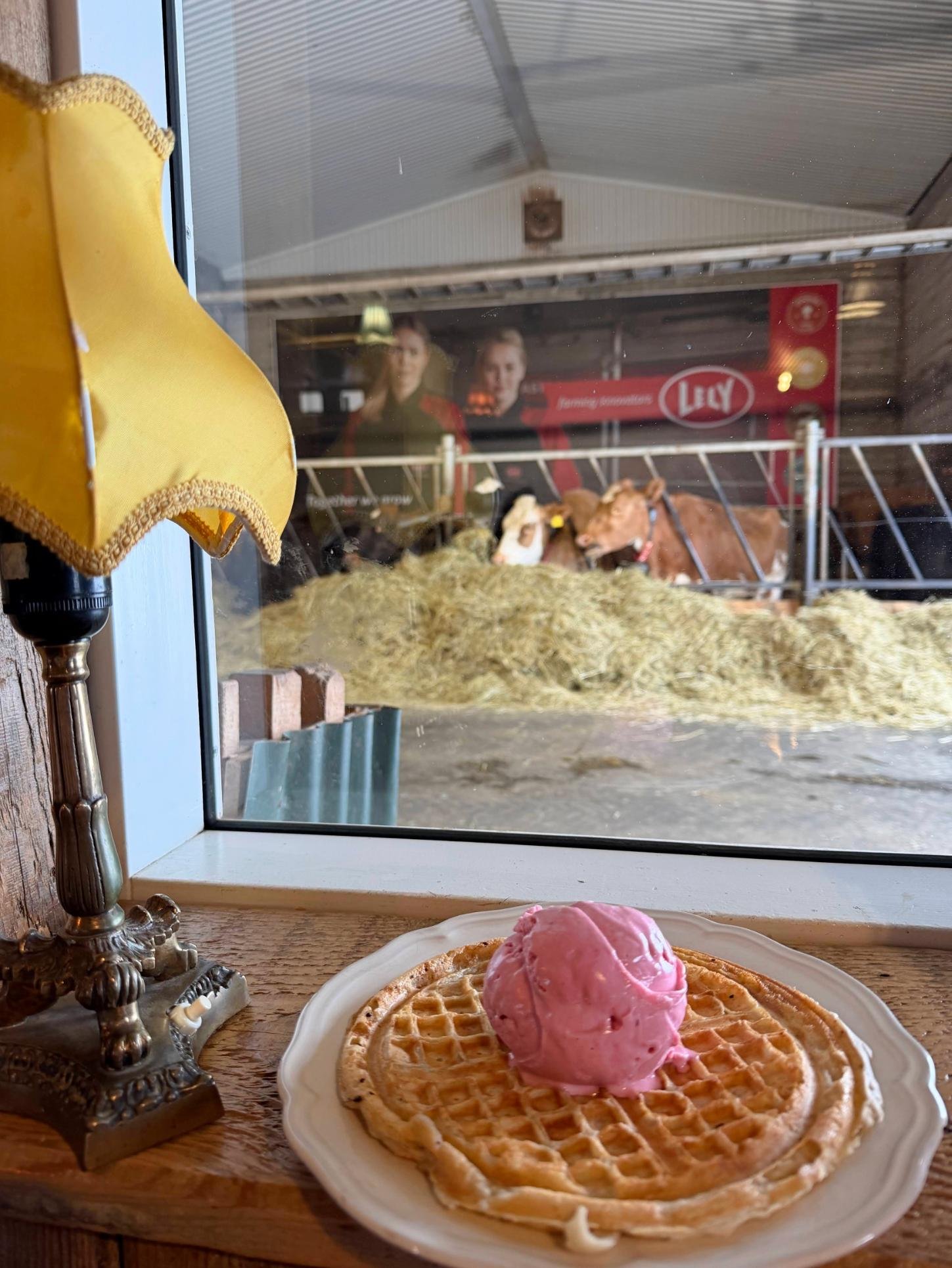 Cows enjoying their hay, us enjoying this waffle with blueberry ice cream at Efstidalur II (thank moo for the milk!)