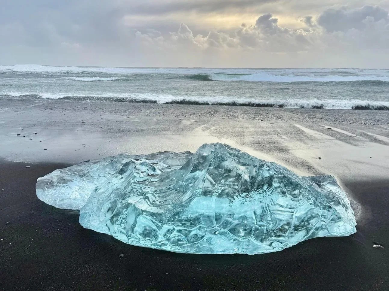 Then, cross the road from the main parking area and walk toward the sea. What you find is Diamond Beach — the stretch of black sand where icebergs washed out to the ocean wash back in and strand themselves on the shore. Blocks of ice from a thousand years ago, backlit and translucent, scattered across volcanic black sand. It's right there, and a surprising number of people who stop at Jökulsárlón never make it across the road. And the ones who do take a quick picture and walk back. And the beach is long!