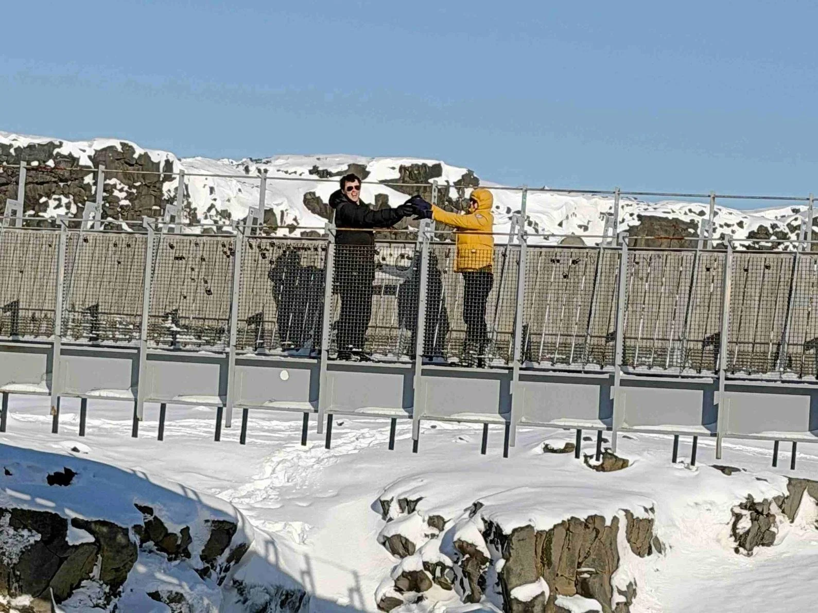 The Bridge Between Two Continents near Sandvík on Reykjanes is a footbridge that literally spans the visible rift between the North American and Eurasian plates. It's free, it's accessible in ten minutes from the car, and standing in the gap looking down into the fissure is the kind of thing that lands differently in person than it sounds on paper. As an American-European couple, it was even cooler for us!